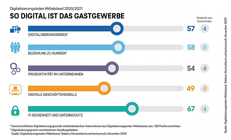 Kaum eine andere Branche leidet mehr unter den Folgen der Corona-Pandemie als das Gastgewerbe. Um die massiven Umsatzeinbrüche abzumildern, nutzen die Betriebe verstärkt digitale Lösungen. Mit 57 von 100 möglichen Indexpunkten haben die Gastrobetriebe den Digitalisierungsgrad gegenüber dem Vorjahr um drei Punkte gesteigert. Zu diesem Ergebnis kommt die Benchmark-Studie „Digitalisierungsindex Mittelstand 2020/2021". Die Erhebung hat techconsult bereits zum fünften Mal im Auftrag der Deutschen Telekom durchgeführt.
