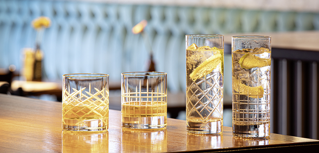 Mit seiner diagonalen Linienführung spiegelt der Dekorschliff „Club" das pulsierende Nachtleben New Yorks wieder: dynamisch, aufregend und voller Begegnungen. Die Geradlinigkeit des Dekorschliffs „Manhattan" hingegen greift die Skyline mit seinem Streben in luftige Höhe auf. Jeder Drink wird durch die Präsentation in diesen Gläsern zum besonderen Moment.