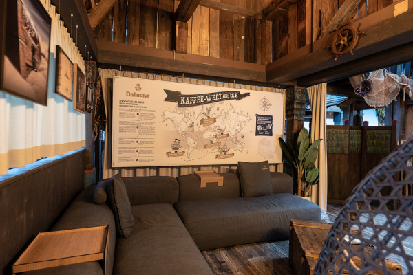 In der Ende 2019 eröffneten Wasserwelt „Rulantica" erwartet die Gäste Action pur. Wer sich zwischen Rutschenspaß und Wellenbad etwas Ruhe gönnen möchte, kann sich eine Komfort Hydda mieten. Die von Dallmayr konzipierte Hydda (Foto links) empfängt die Gäste mit Seefahrer-Flair und maritimen Interieur. Während die Badegäste bei einem Kaffee oder einer wohltuenden Tasse Tee entspannen können, sind die kleinen Entdecker zu einer Schatzsuche eingeladen: Wer das Rätsel löst, wird mit einem Dallmayr Schatz belohnt.
