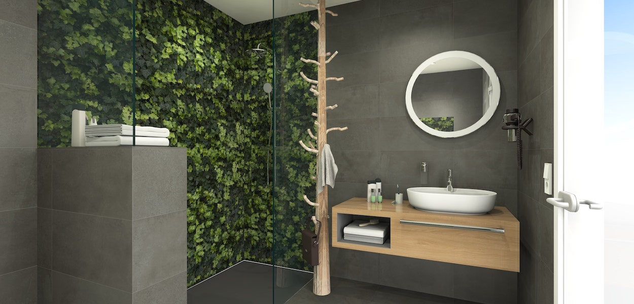 Nun ragt ein Baum als Wäscheständer im Bad in die Höhe, die Tapete simuliert einen Wald, die Möbel sind mehrfach einsetzbar – so ist beispielsweise die Kofferablage auch gleichzeitig Sitzbank, Schuhschrank und Safe – und sind aus nachwachsenden Rohstoffen.
