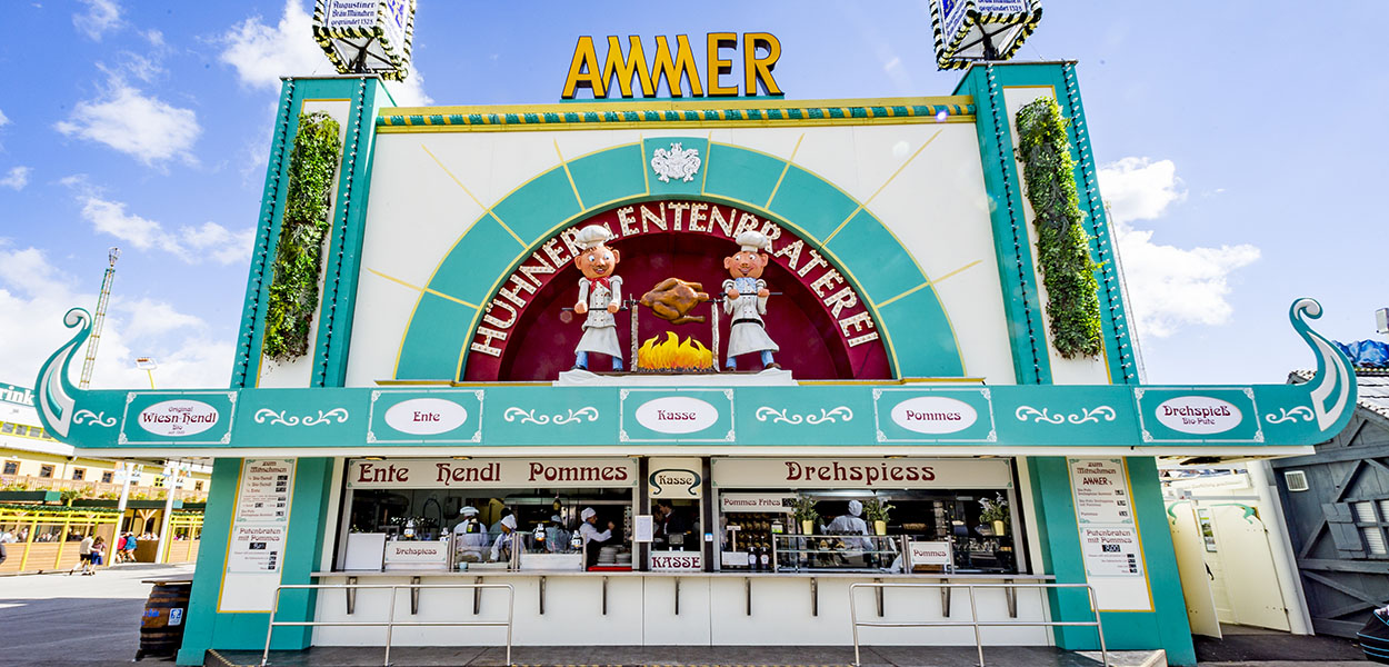 Das zweitälteste Zelt ist bereits seit 1885 ein Herzstück des Oktoberfests. Auf ihrer diesjährigen 140. Wiesn strahlt die älteste Hühnerbraterei der Welt in frischem Glanz. Die traditionelle Zeltsegnung durch das Augustinerkloster Maria Eich wenige Minuten vor dem Anstich lässt alle innehalten – bevor es richtig losgeht. Newcomer und bekannte Musiker bringen tagsüber Schwung. Abends rockt die bekannte Partyband Tetrapack erstmals das Ammer-Zelt. Dabei wird es magisch mit neuem (Sternen-)Himmel und Sternenglitzer.
