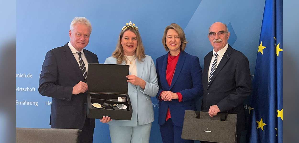 Der Präsident des Fränkischen Weinbauverbands Artur Steinmann und die Fränkische Weinkönigin Antonia Kraiß trafen auf Vermittlung der Bundestagsabgeordneten Dr. Anja Weisgerber den Bundeslandwirtschaftsminister Alois Rainer in Berlin. Thema des rund einstündigen Gespräches war unter anderem die Förderung von deutschem Wein im Heimatmarkt. Derzeit stammen von zehn verkauften Flaschen rund sechs Flaschen aus dem Ausland.
