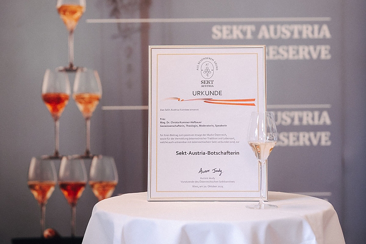 Aurore Jeudy, Vorsitzende des Sekt-Austria-Komitees, zur frisch gekürten Sekt-Austria-Botschafterin: "Dr. Christa Kummer-Hofbauer sind Themen wie Umwelt und Soziales wichtig, vor allem ist sie ein Genussmensch und versteht, die Menschen mit ihren Vorträgen zu begeistern. Ich bin sicher, dass wir mit ihrer Unterstützung viele neue Fans für Sekt Austria gewinnen können!" Die Neo-Sekt-Austria-Botschafterin konnte aufgrund einer kurzfristigen Erkrankung der Veranstaltung nicht persönlich beiwohnen – umso mehr gilt es, sich auf das Nachholen des feierlichen Festakts zu freuen.