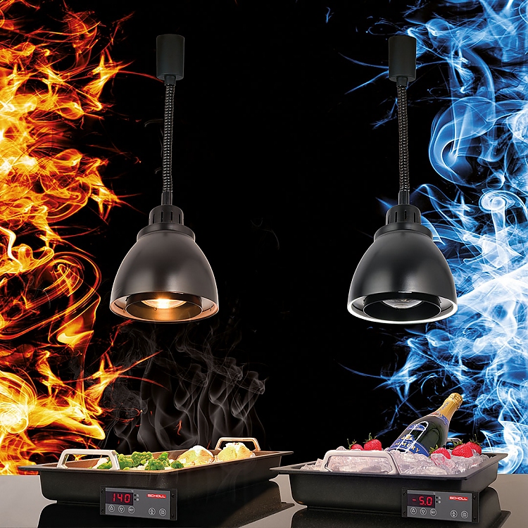 Kombination aus Funktion und Stil: Der Wärmestrahler "massiv Heiß-Kalt" kombiniert kraftvolle 250 W Infrarot-Wärme mit stimmungsvollem LED-Warmweißlicht (3000 K) – für appetitlich präsentierte und optimal temperierte Speisen. Stufenlos höhenverstellbar (850–1.700 mm) mit flexiblem Spiralkabel passt er sich nahezu jeder Buffet- oder Thekensituation an. Wahlweise auch mit Rotlichtstrahler erhältlich. In edlem Schwarz oder Chrom ist er nicht nur funktional, sondern ein echter Hingucker – stilvoll, effizient und wie gemacht für den professionellen Einsatz.