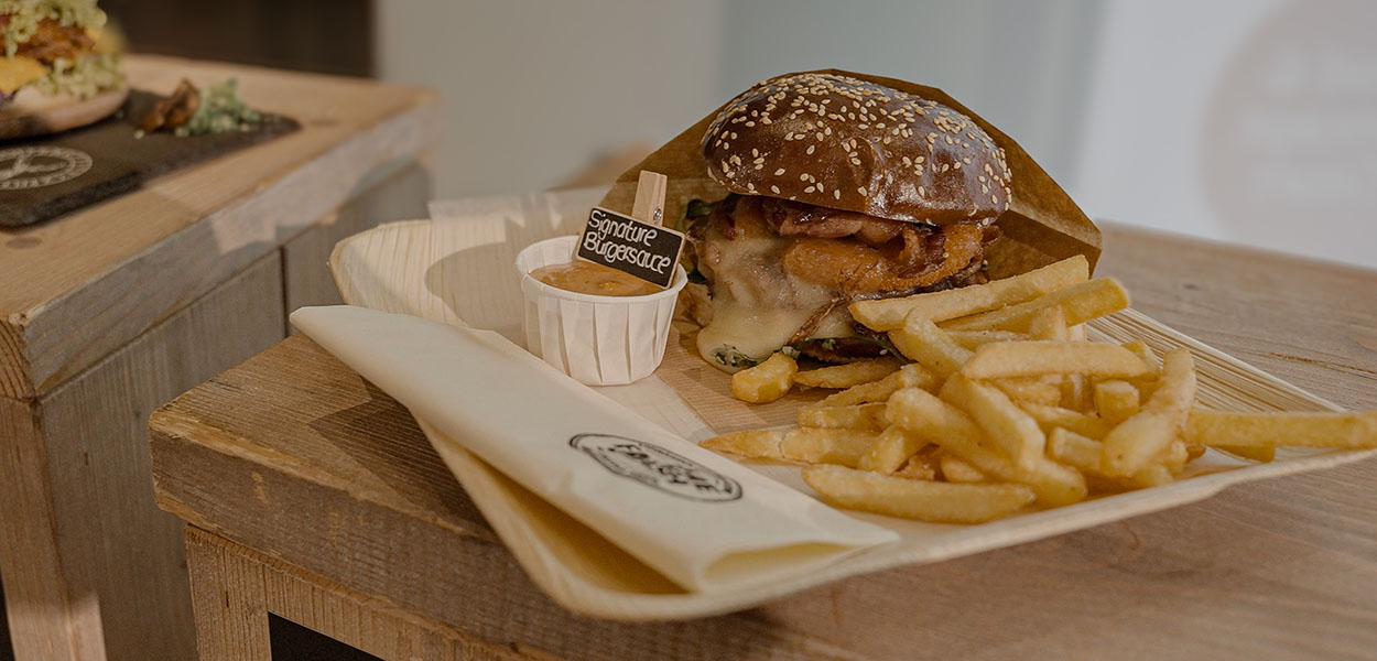 "Der falsche Smash" kombiniert den glänzenden Sesam-Laugen-Bun von Schulstad Bakery Solutions mit einem saftigen Rindfleisch-Patty, frischem Rucola, knusprigem Bacon von Danish Crown und einem smashed Camembert mit flüssigem Kern – abgerundet durch ein hausgemachtes Zwiebelchutney. Eine kreative Komposition, die moderne Gastronomie mit klassischem Handwerk verbindet.