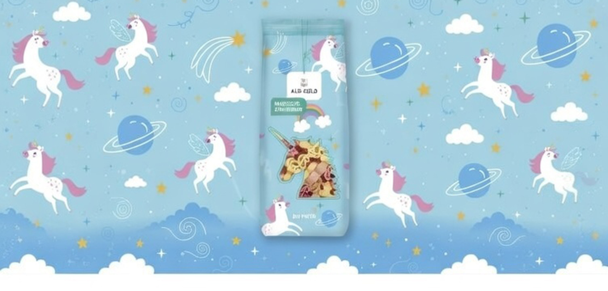 Die Basis der Nudeln stellt ökologisch angebauter Hartweizengrieß dar, wobei ein Teil der Einhorn-Pasta-Formen mit natürlichem Gemüsekonzentrat leicht rosa eingefärbt wird.