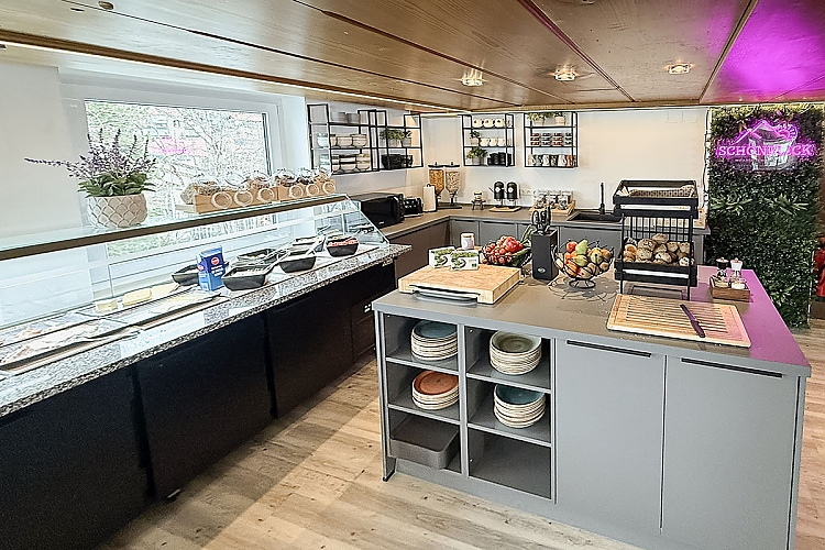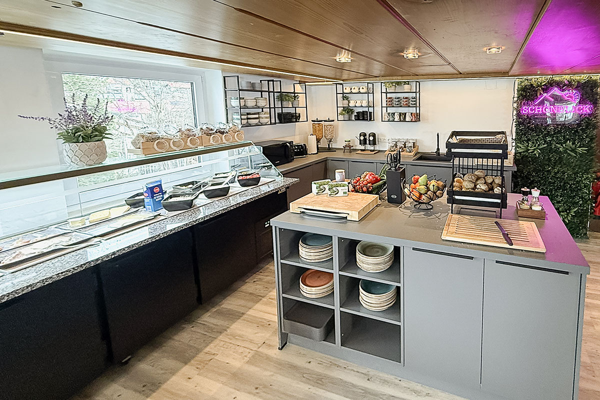 Ein zentraler Bestandteil ist das Verpflegungskonzept: Die Küche bietet Frühstück von 7:00 bis 10:30 Uhr, Mittagessen von 11:30 bis 14:00 Uhr sowie rund um die Uhr Obst und Getränke. Alle Mahlzeiten werden aus frischen, regionalen Produkten zubereitet – in der gleichen Qualität wie für Gäste. Umsetzung und Betrieb liegen in den Händen der Auszubildenden in Küche und Service, die das Essen über ein Selbstbedienungssystem bereitstellen.