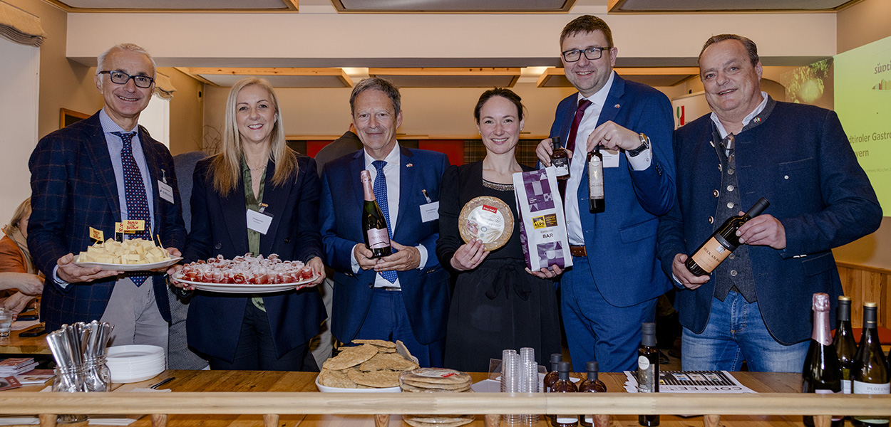 Auftakt für das Südtiroler Genussprojekt (v. l.): Alessandro Marino, Italcam-Geschäftsführer, Francesca Fiori (IDM Südtirol), Reiner Hebermehl (Dehoga Bayern), Elisa Abetini (IDM Südtirol) sowie Thomas Quiram (Dehoga Bayern, Regionalgeschäftsführer Oberbayern) und Alexander Maffei (Dehoga Bayern).